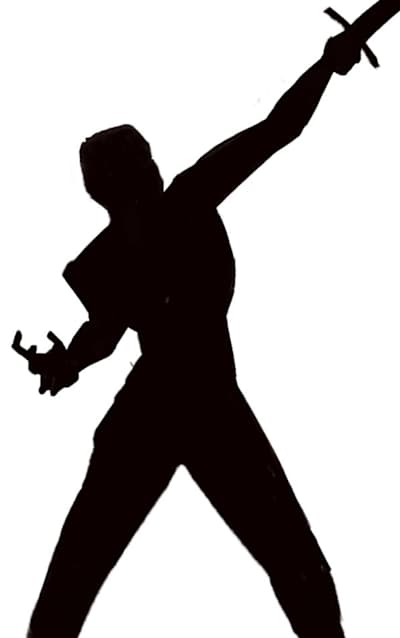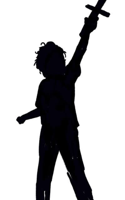 At first, I tried doing a few sketches, all of which turned out terrible. Then I found a stock photo of a young boy holding up a sword and thought the pose was pretty good. I copied it into a silhouette using an iPad and Apple Pencil in Procreate.